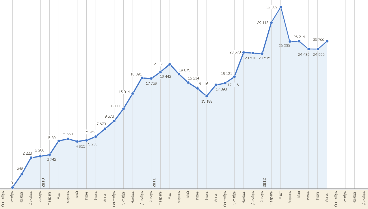 График роста уникальных посетителей сайта www.tateda.ru с октября 2009 по август 2012