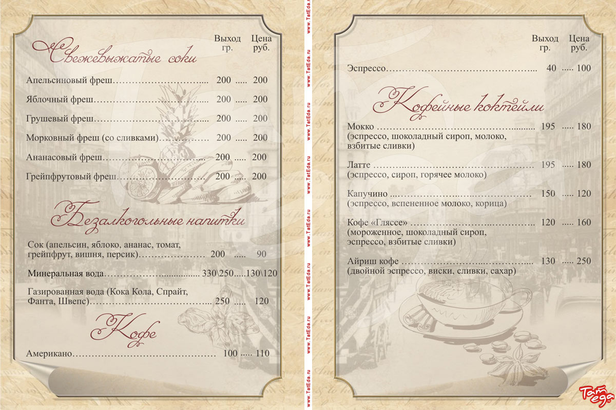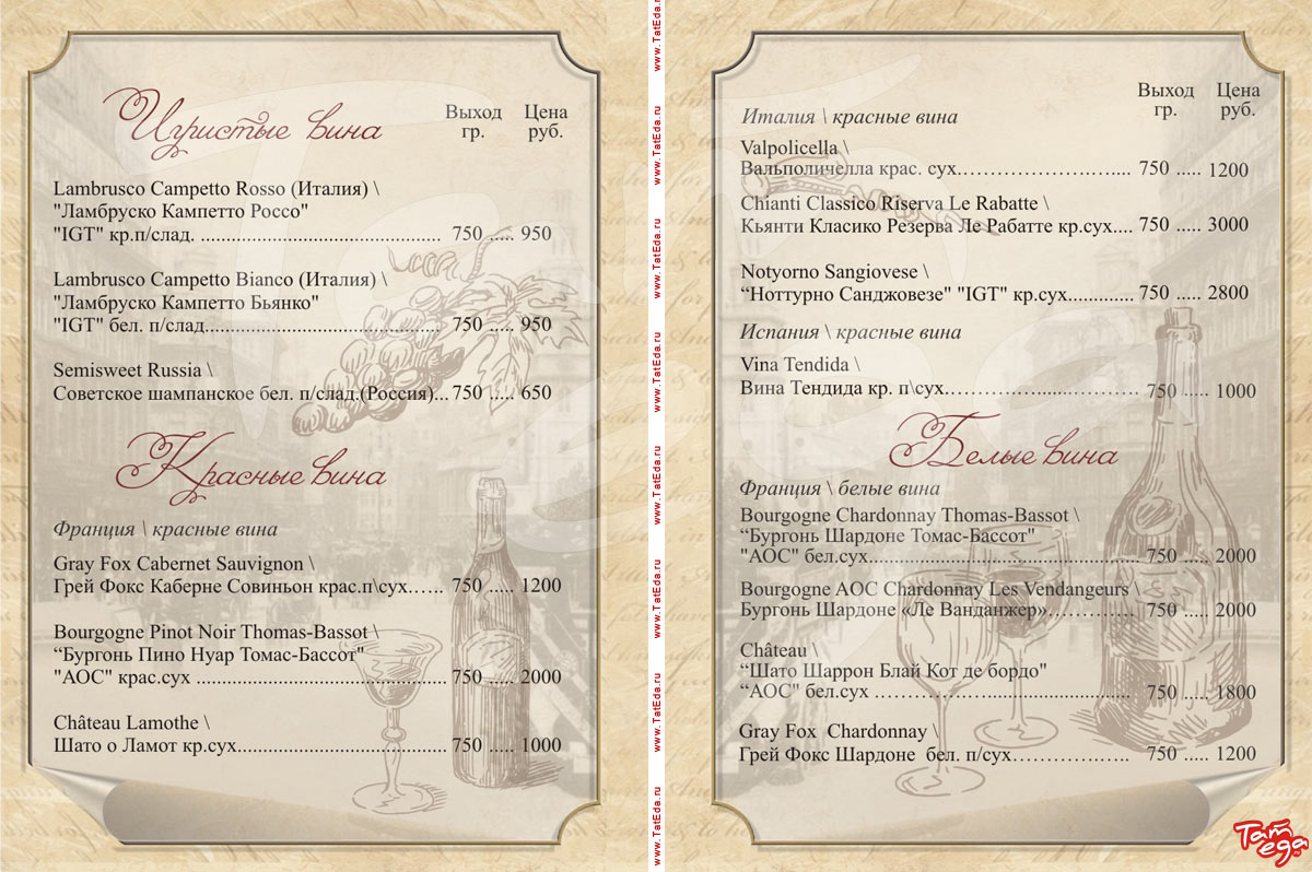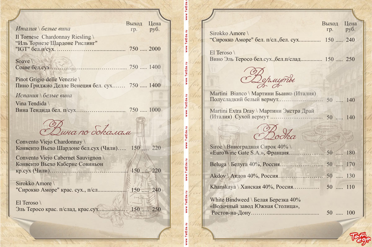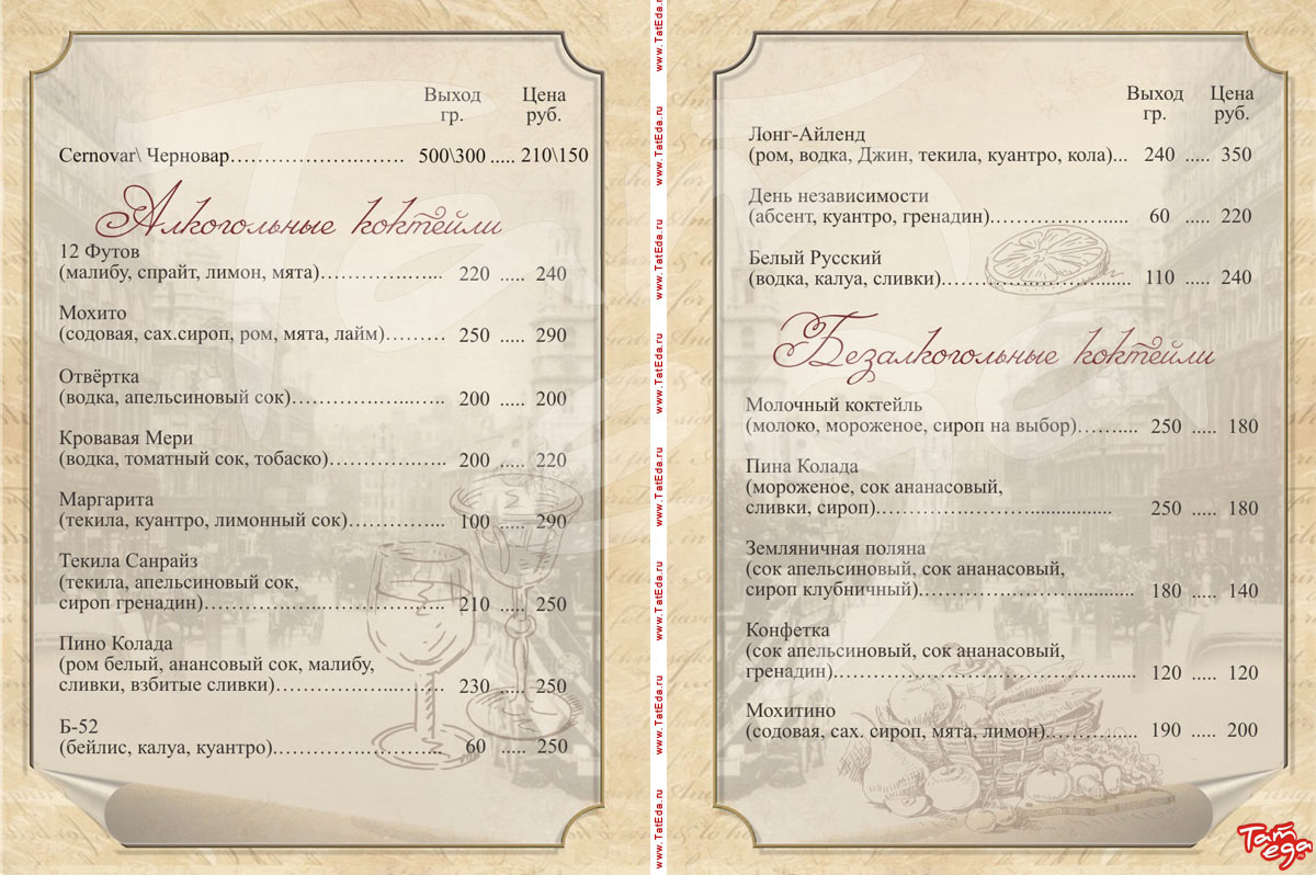 Особенности: бизнес-ланч, винотека, еда на вынос, кальян, коктейльная карта, разливное пиво, десерты и выпечка собственного изготовления, сигарная карта, торты на заказ.