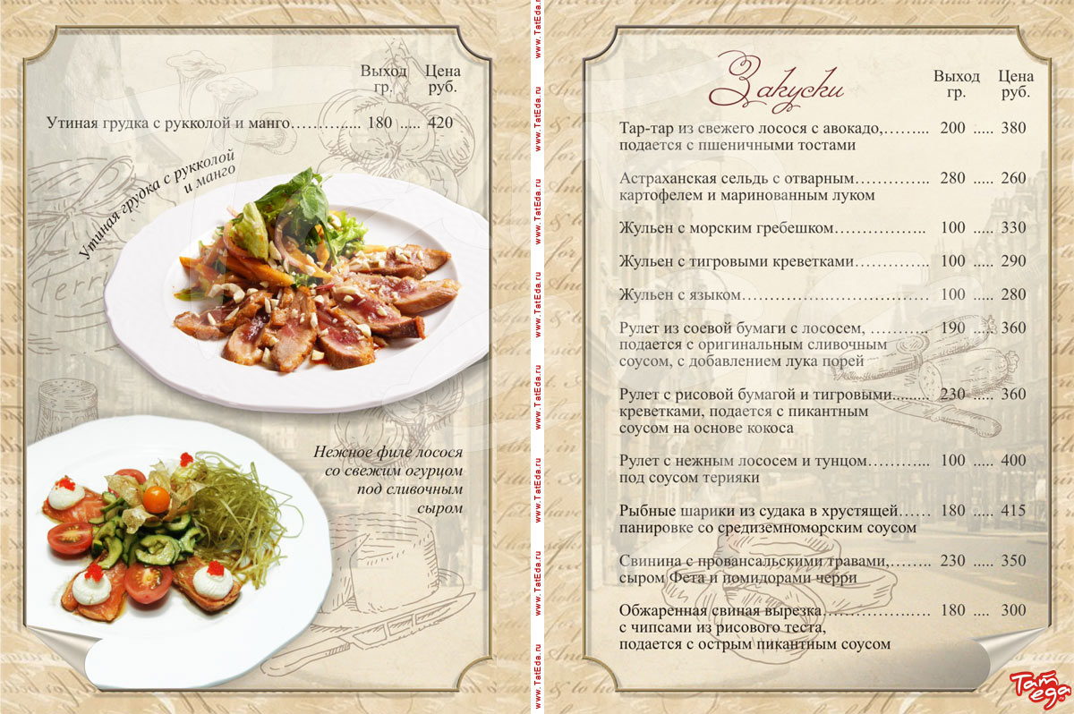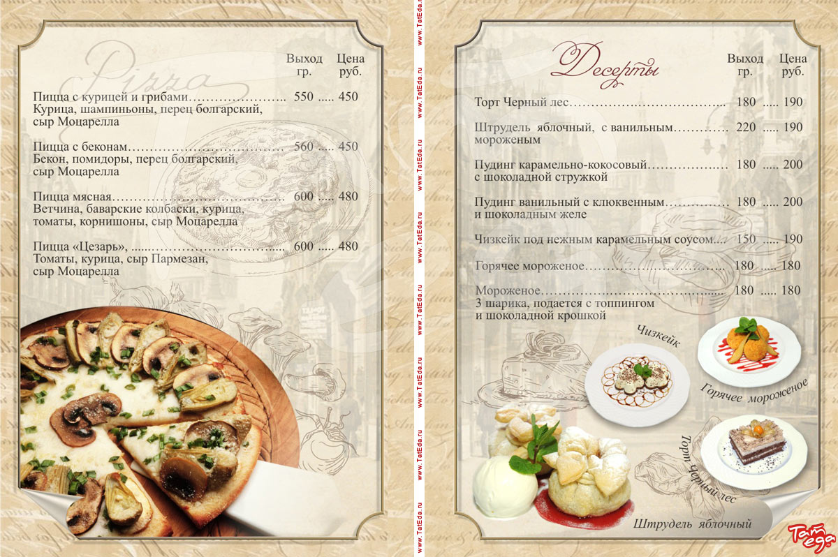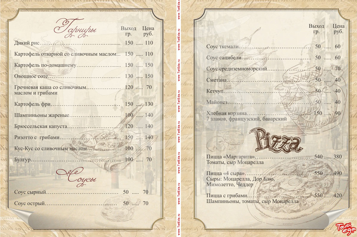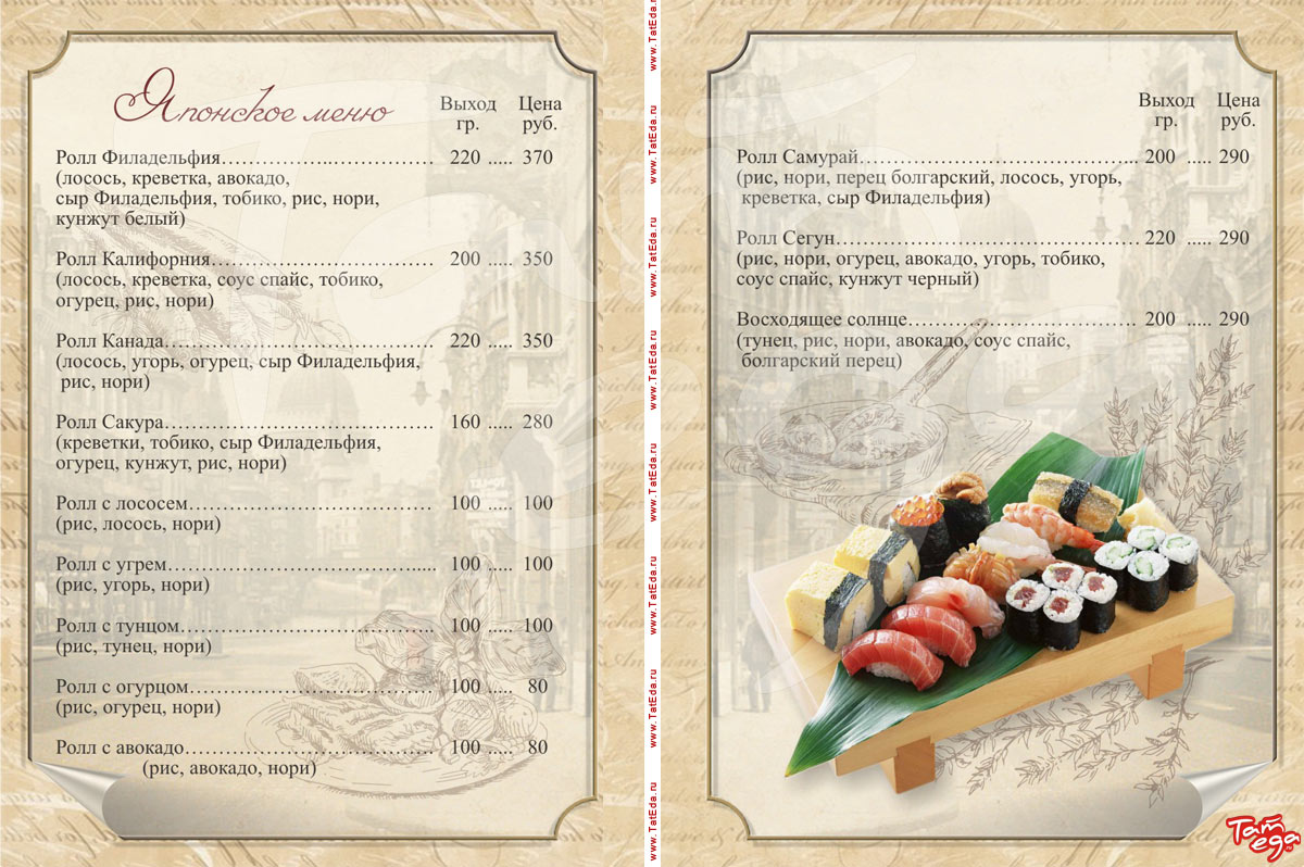салаты, холодные закуски, горячие закуски, гарниры, соусы, пицца, японское меню, десерты, кофе, соки, чай, сигареты, кальян