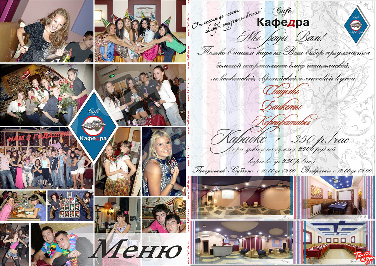Кафе "КАФЕДРА" заставит вернуться в студенческую пору тех, кто уже давно был студентом, а так же поможет настоящим студентам отдохнуть от их тяжелого студенческого жития-бытия. Кафе покорит Вас вкусной кухней, большим выбором напитков алкогольных, а так же безалкогольных, хорошим обслуживанием, уютной обстановкой. Если Вы находитесь недалеко от центра обязательно заходите на обед, у нас Вас покормят вкуснейшей пиццей, суши, а из европейского меню можно выбрать блюдо на любой вкус. Мы гарантируем, что Вам понравится, и вы не уйдете от нас голодными. Посетив нас один раз, мы уверены, Вы обязательно вернетесь к нам в нашу спокойную, стильную обстановку.