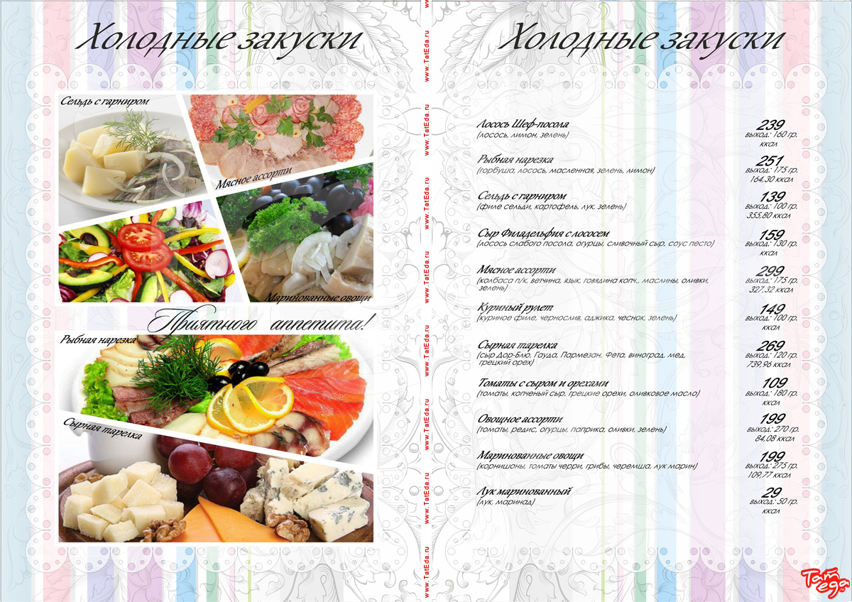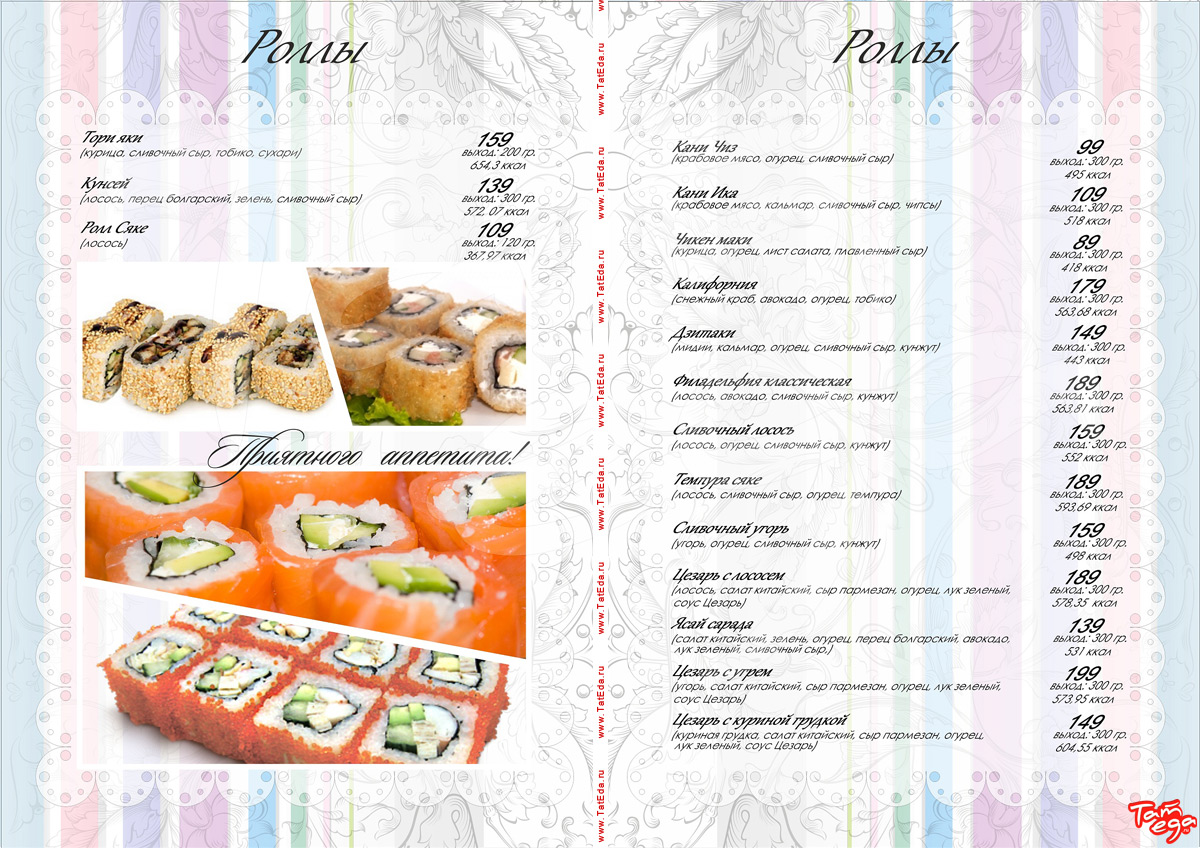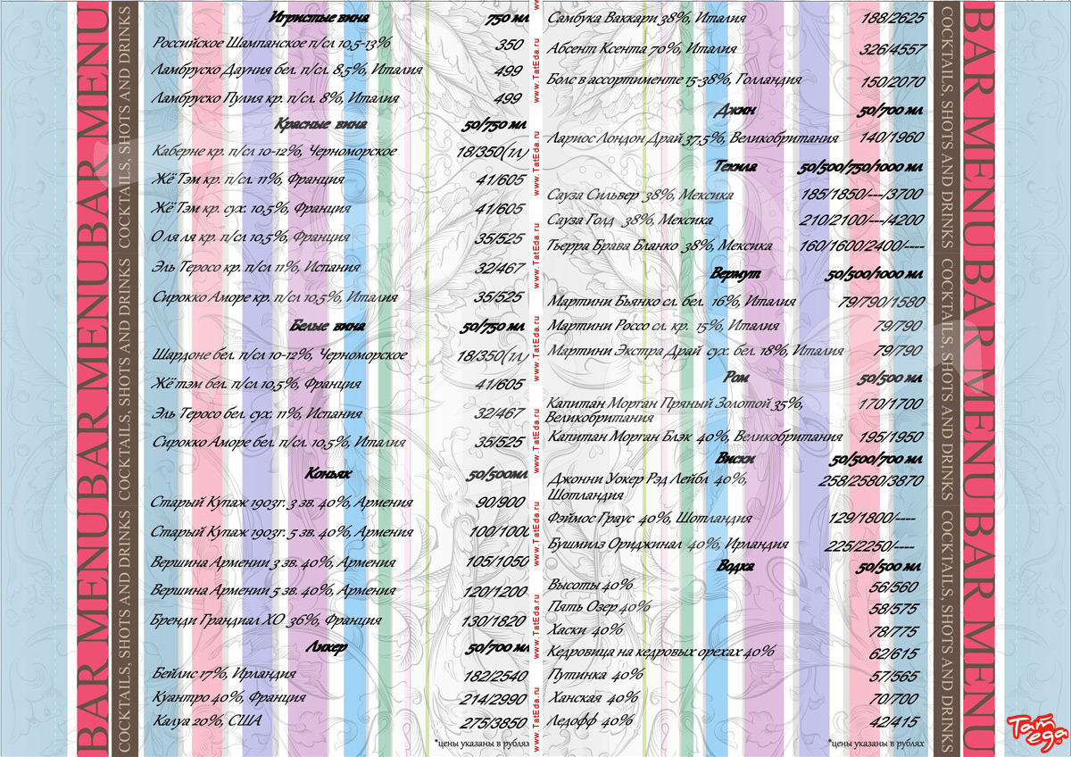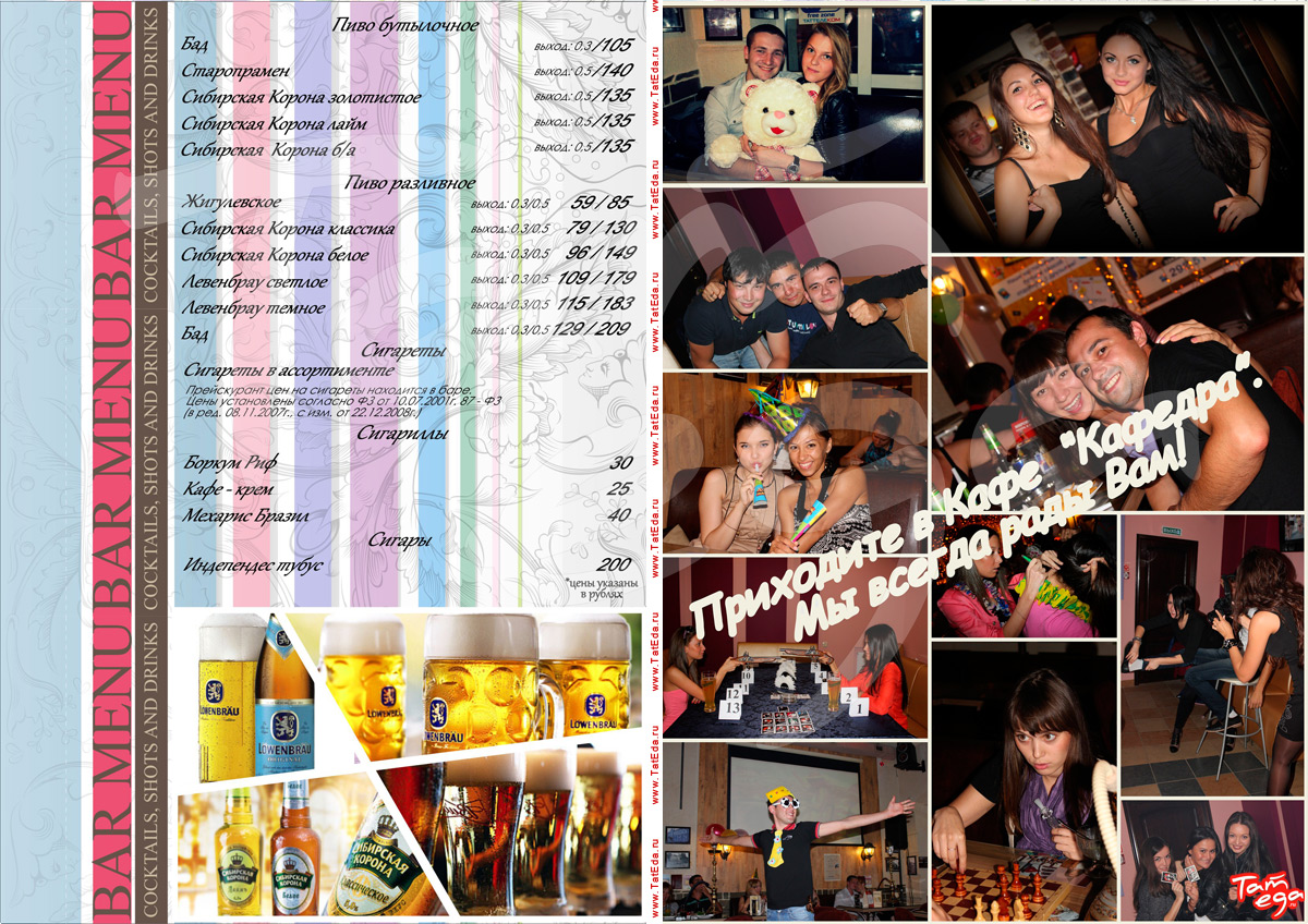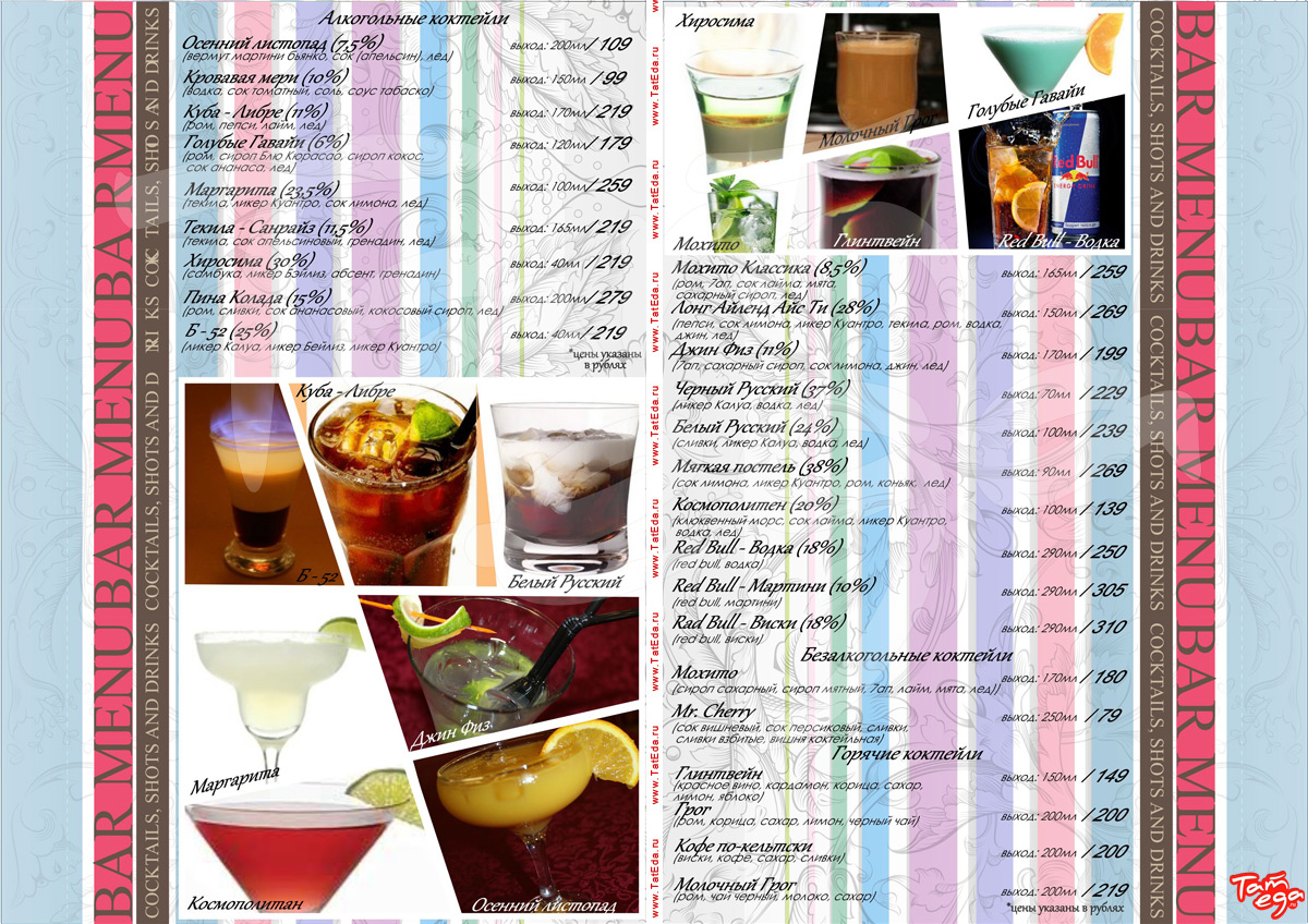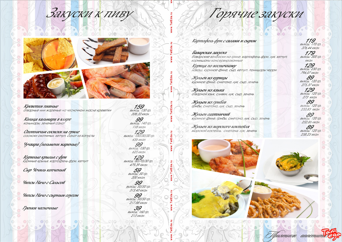 холодные закуски, салаты, горячие закуски, закуски к пиву, супы, горячие блюда, пицца, роллы, десерты, мороженое, коктейли, чай, кофе, напитки, кальян, сигареты, карта бара