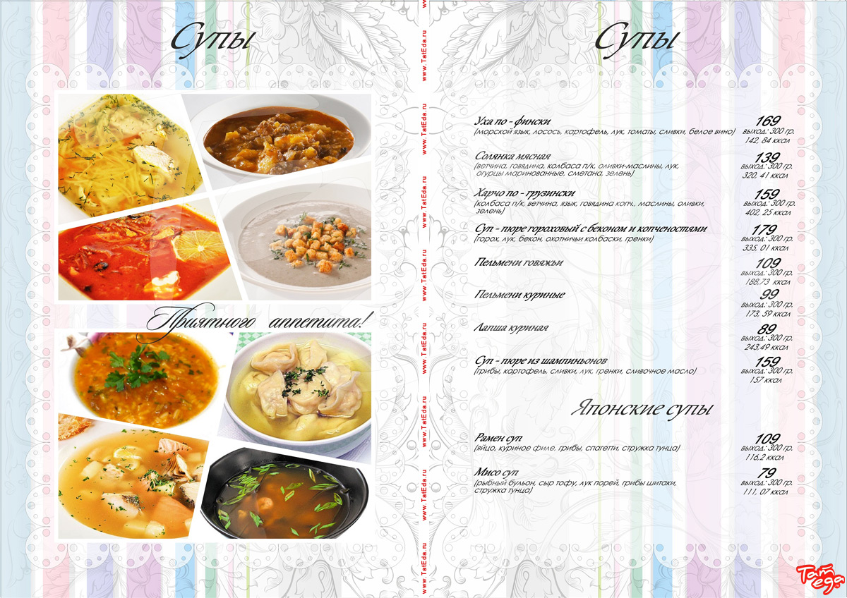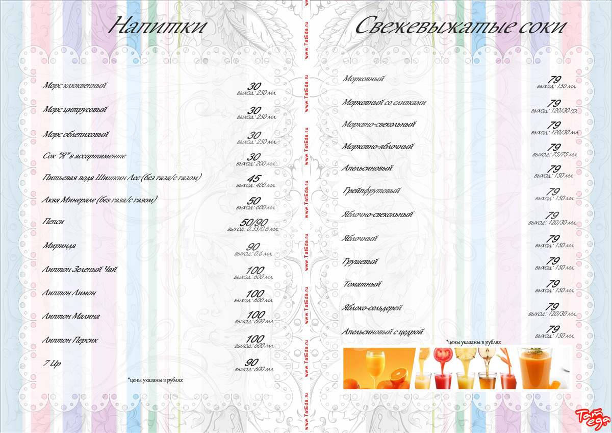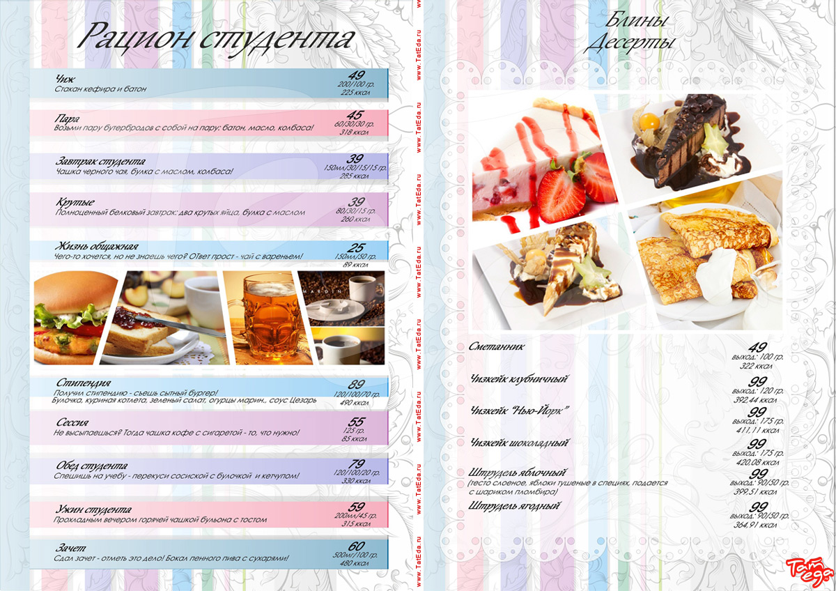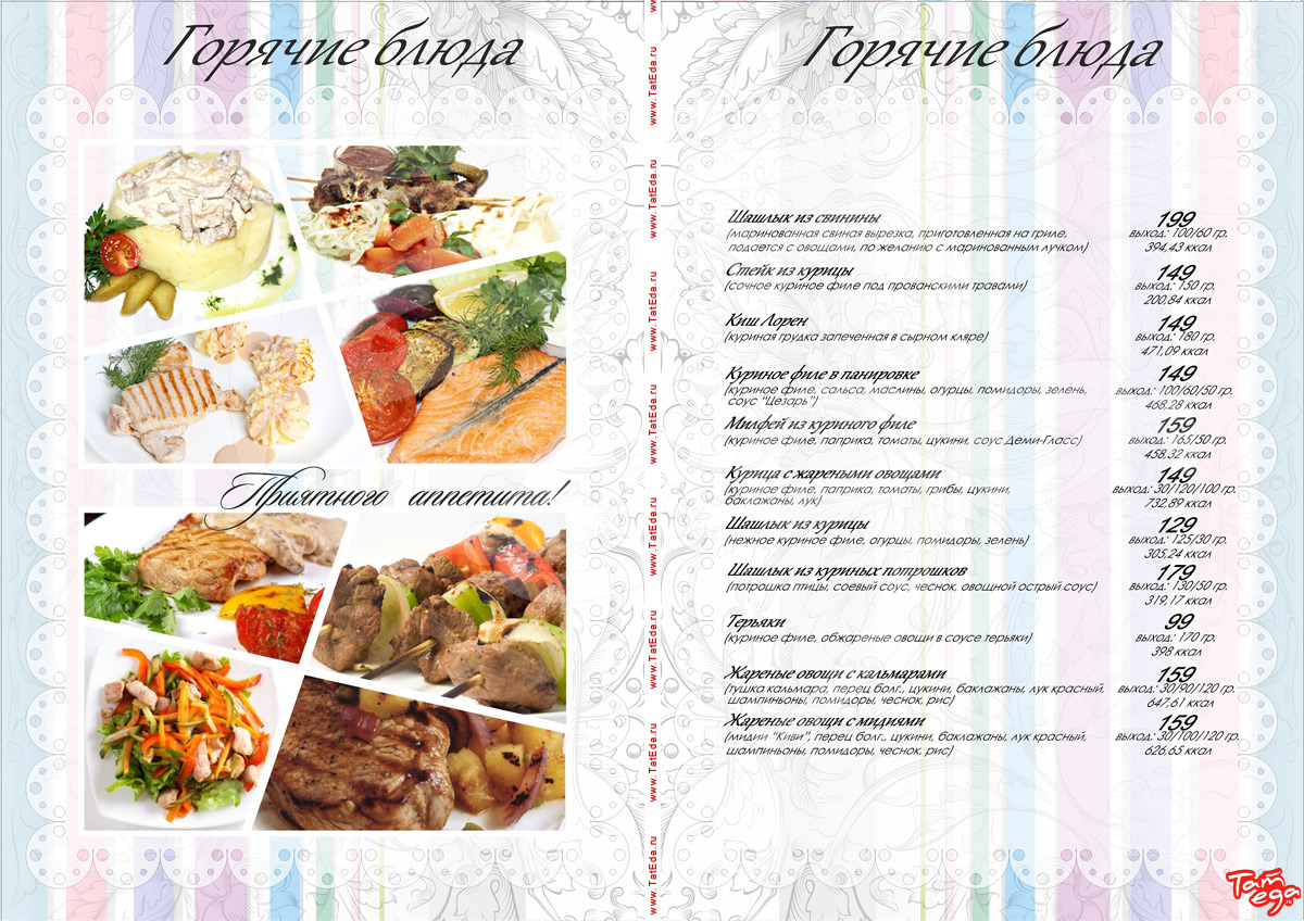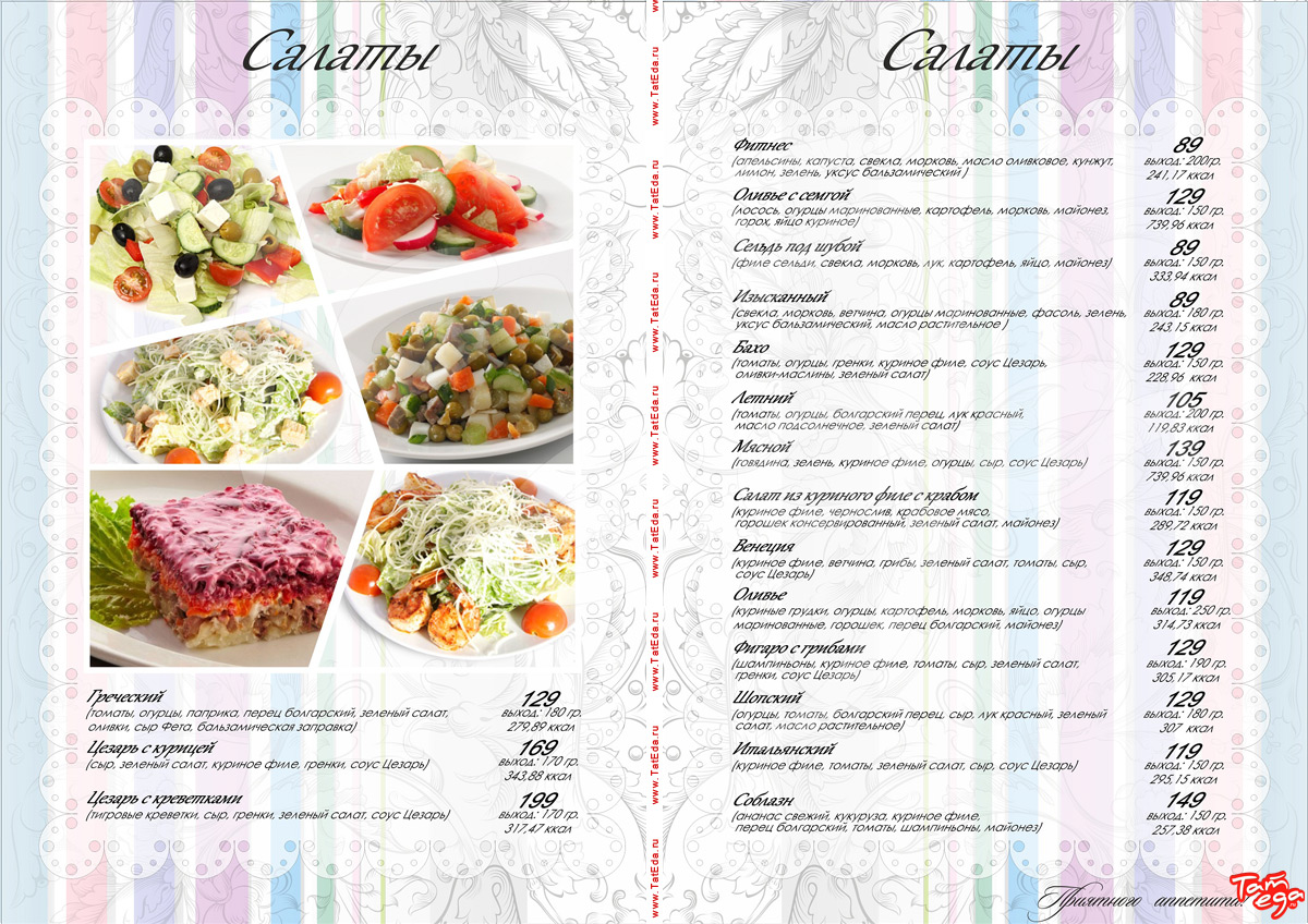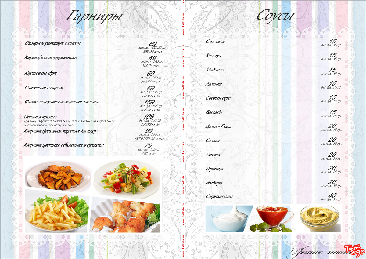 холодные закуски, салаты, горячие закуски, закуски к пиву, супы, горячие блюда, пицца, роллы, десерты, мороженое, коктейли, чай, кофе, напитки, кальян, сигареты, карта бара